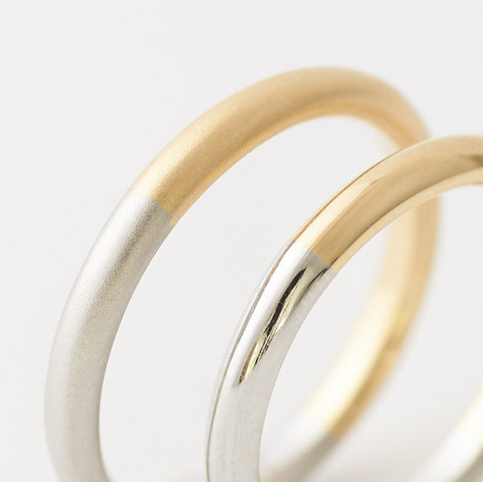 以前に展開していたコンビリングは、K18イエローゴールドのリングの半分にロジウムコーティングというメッキ加工を施し、白く見えるようにしたものでした。ただ、あくまでもメッキなので、時間の経過とともに剥がれてきます。お客さまから「メッキが剥がれてきて」とご相談いただき、メッキをかけ直したことも何度かありました。