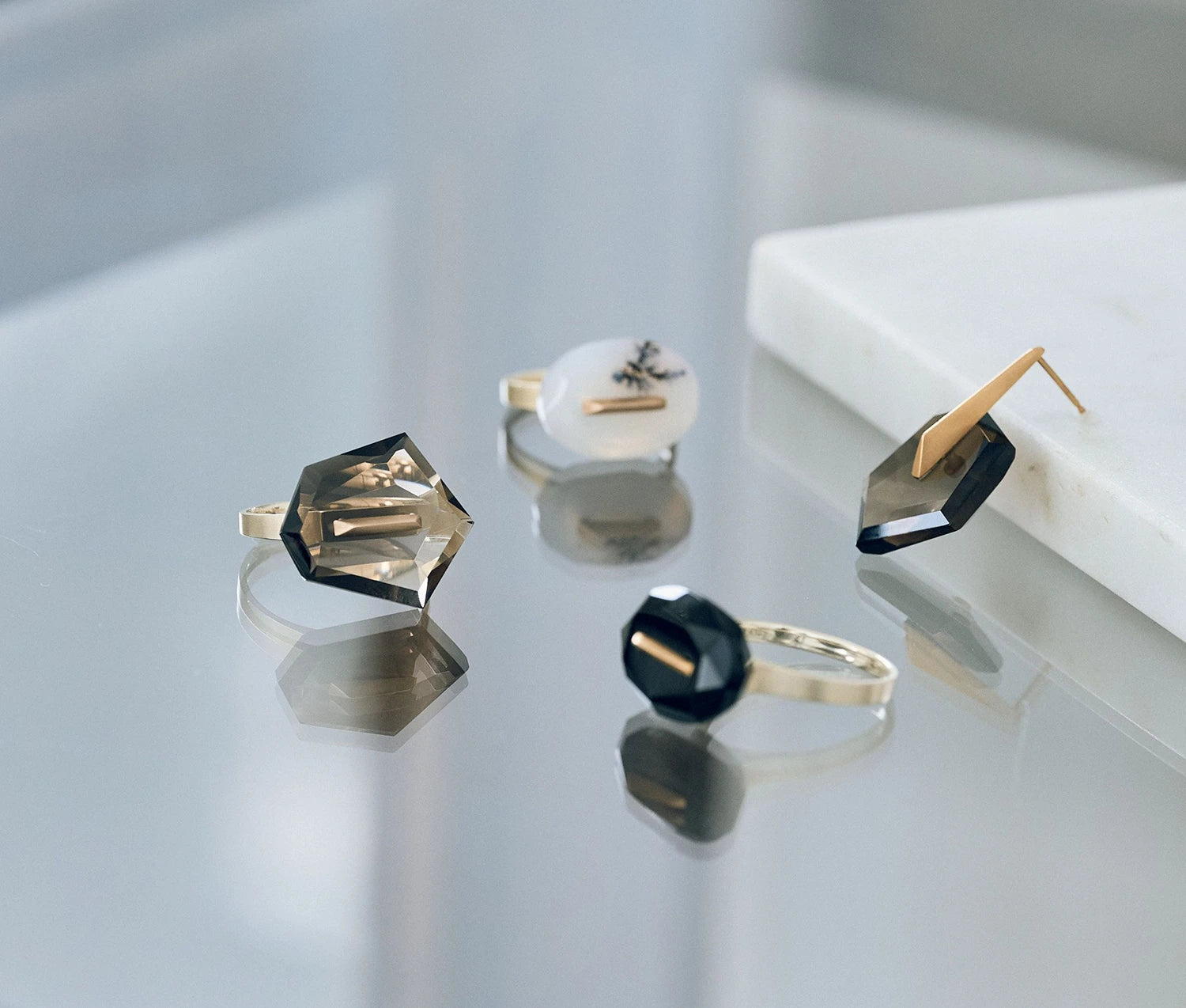 コレクション『Staple』の新作アイテムも登場予定。定番のバイカラースモーキークオーツやルチルクオーツなどはもちろん、本コレクションでは初登場となるマザーオブパール、ラピスラズリをあしらったアイテムなど、オンラインには掲載していないアイテムも会場に並びます。(ピアスおよび一部のリングは即売可能なアイテムのため、その場でお持ち帰りいただくことができます)