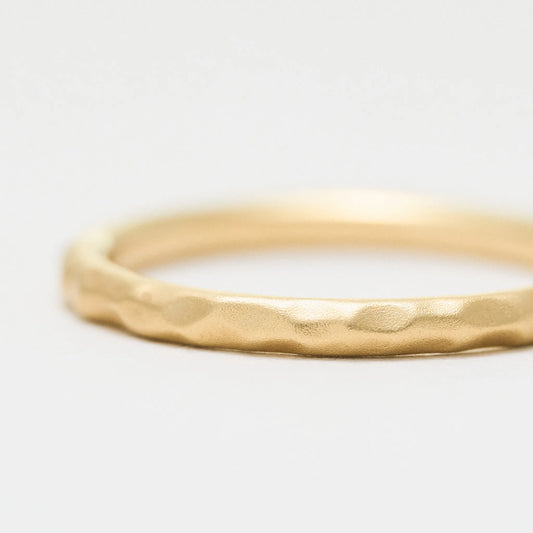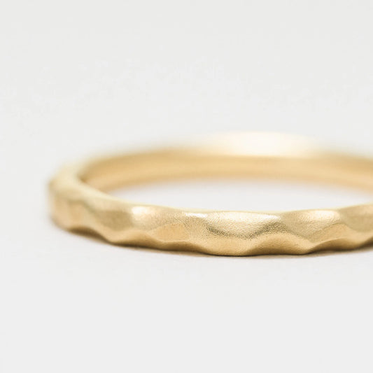 職人がリングの表面をハンマーで何度も打ちつけてできる槌目(つちめ)模様を活かしたデザイン。