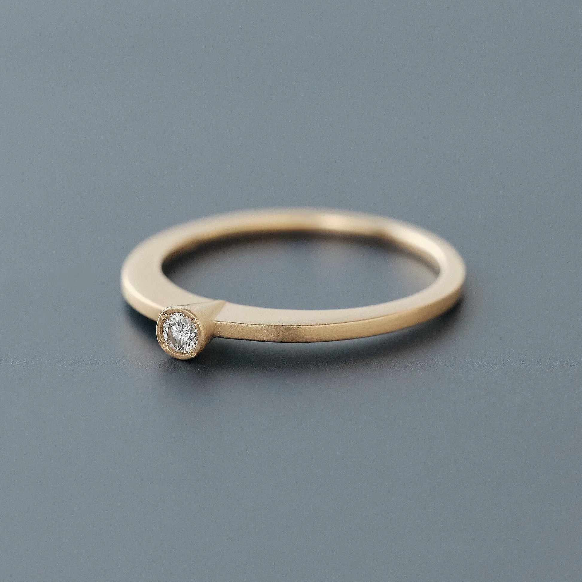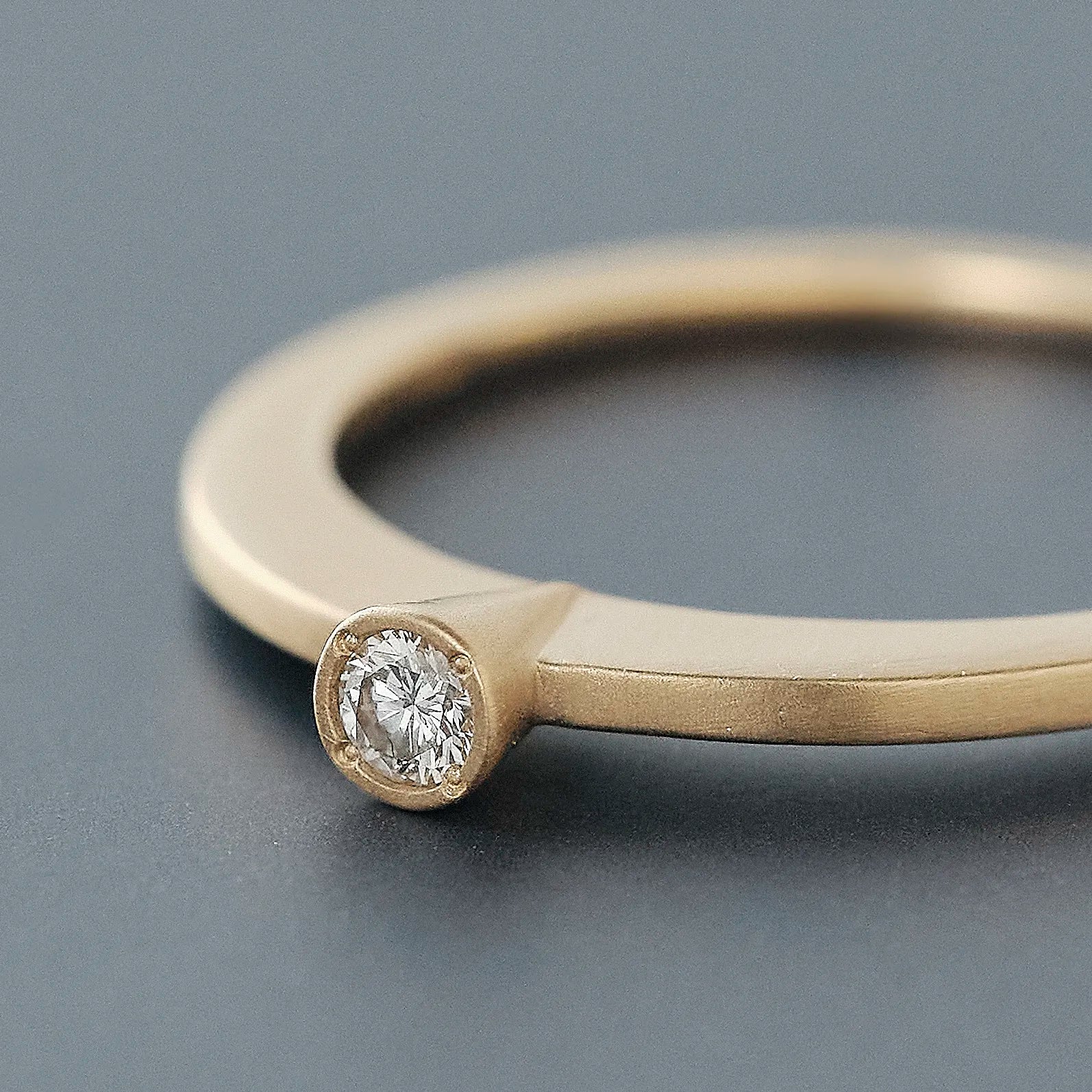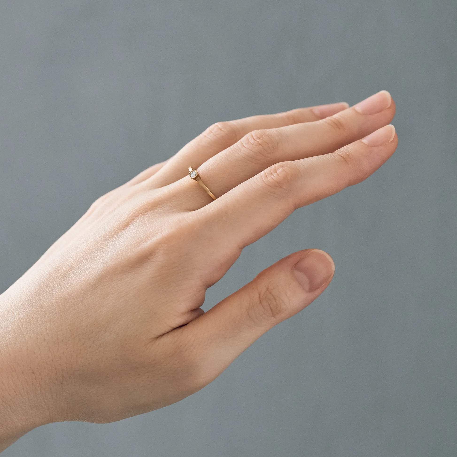 The ultra-thin setting draws in light, making the diamond's sparkle even more striking. The structural design, where straight and curved lines intersect, brings a subtle presence to your fingertips.