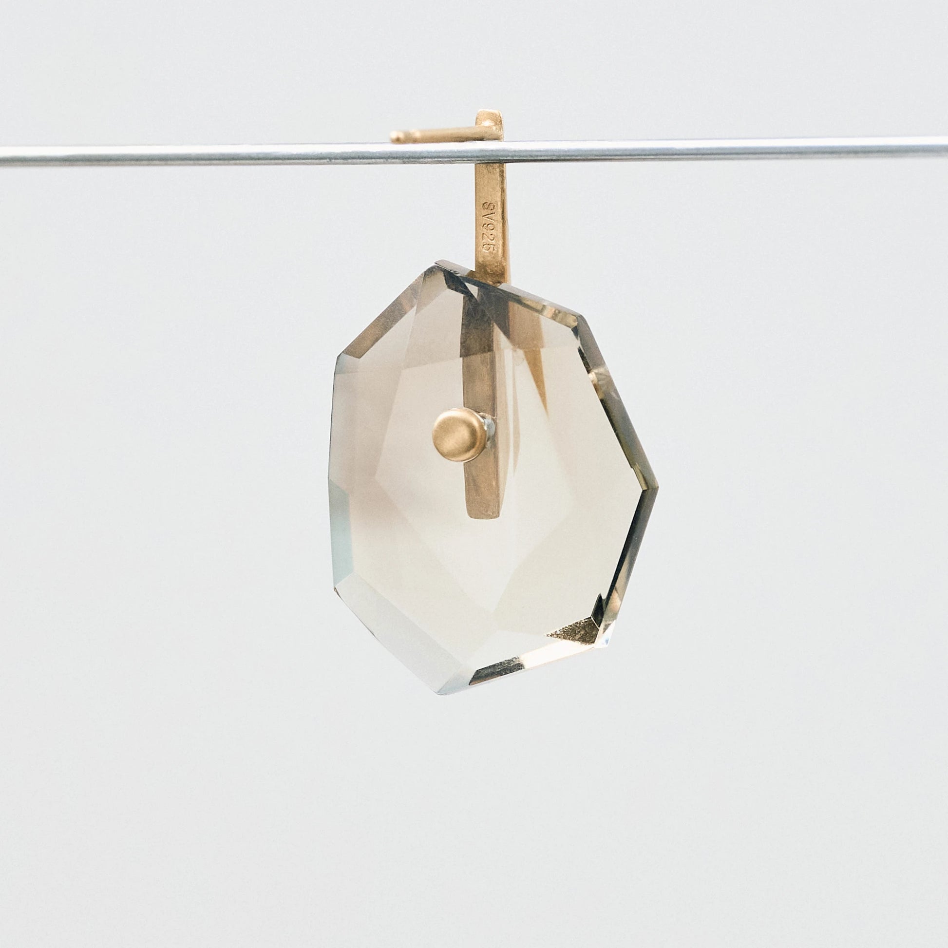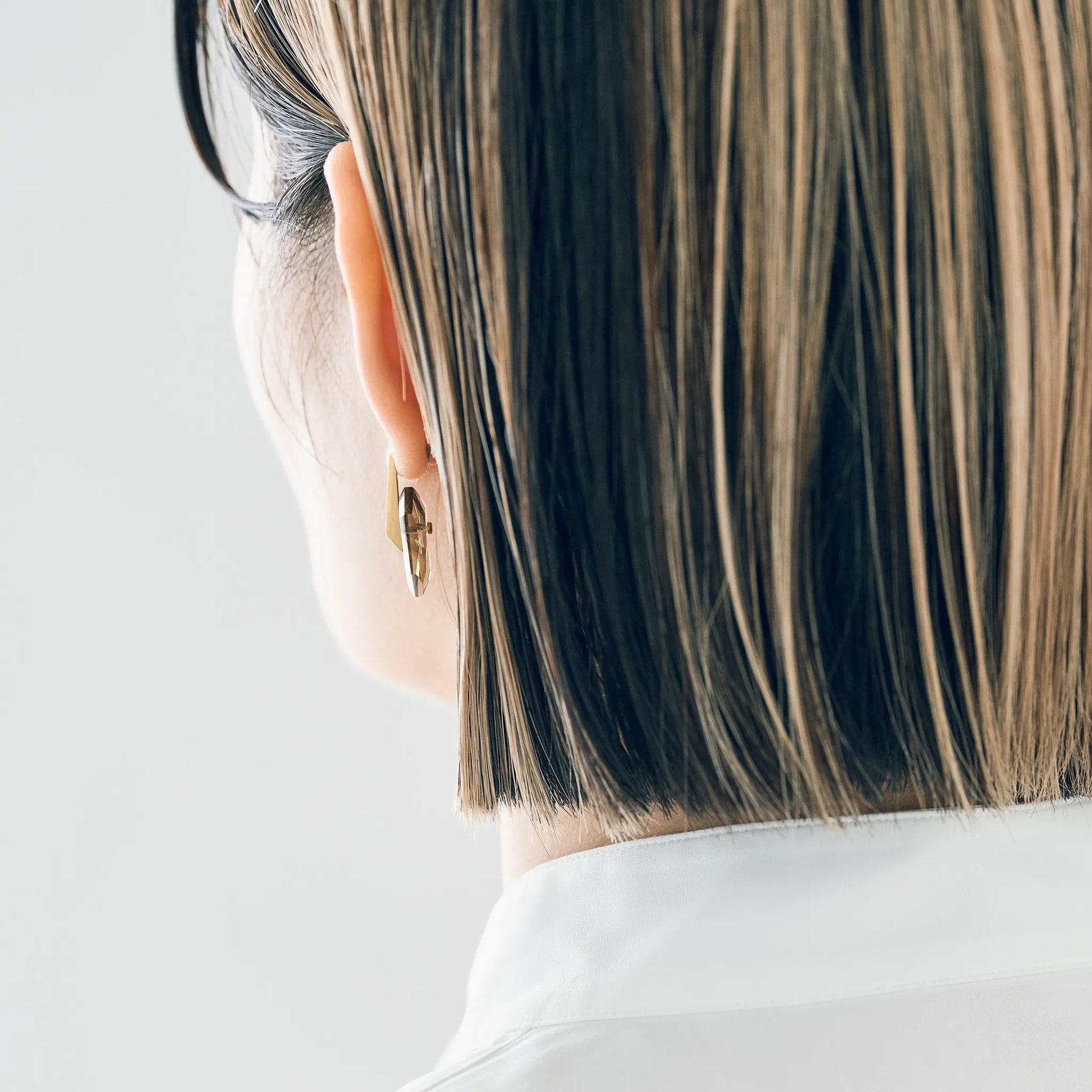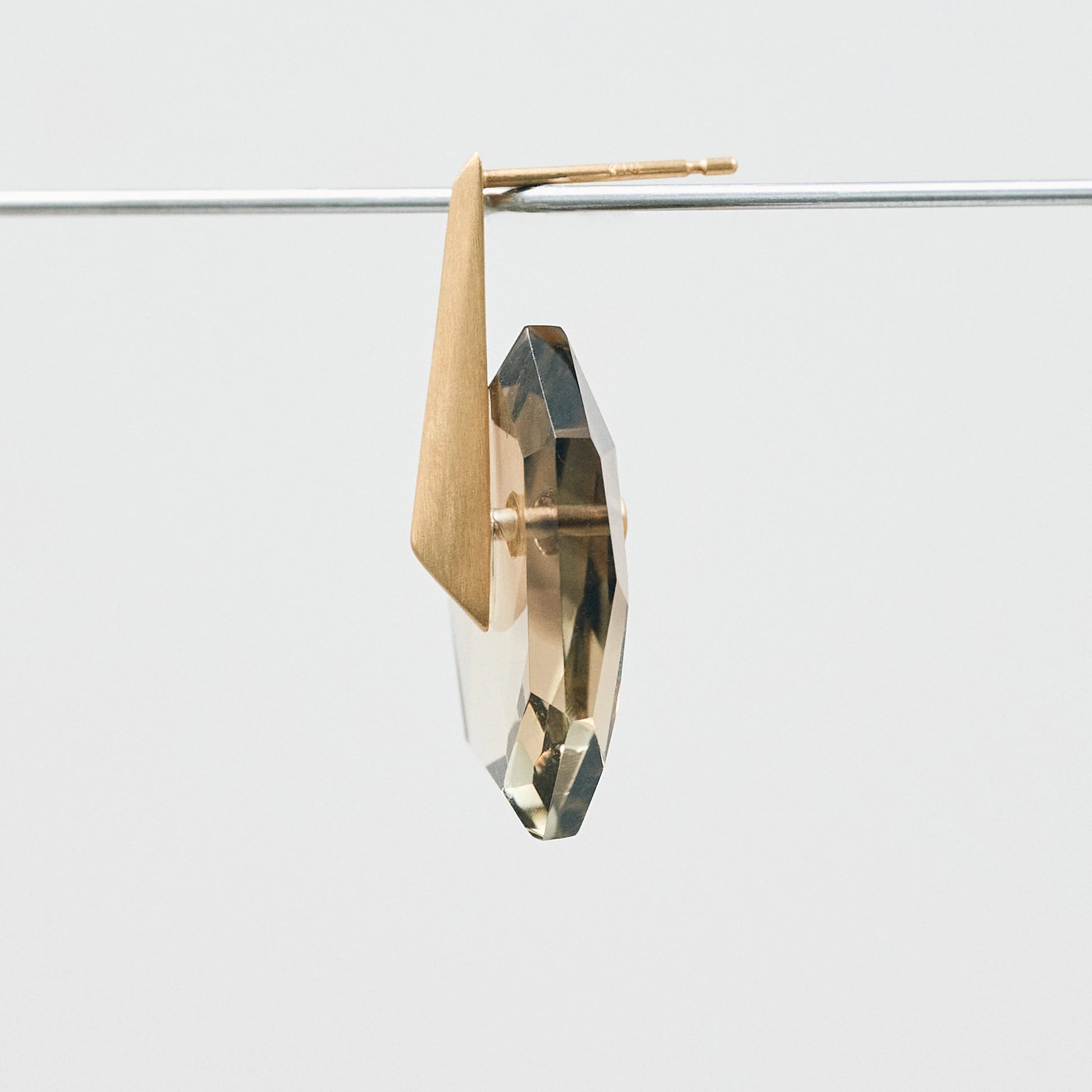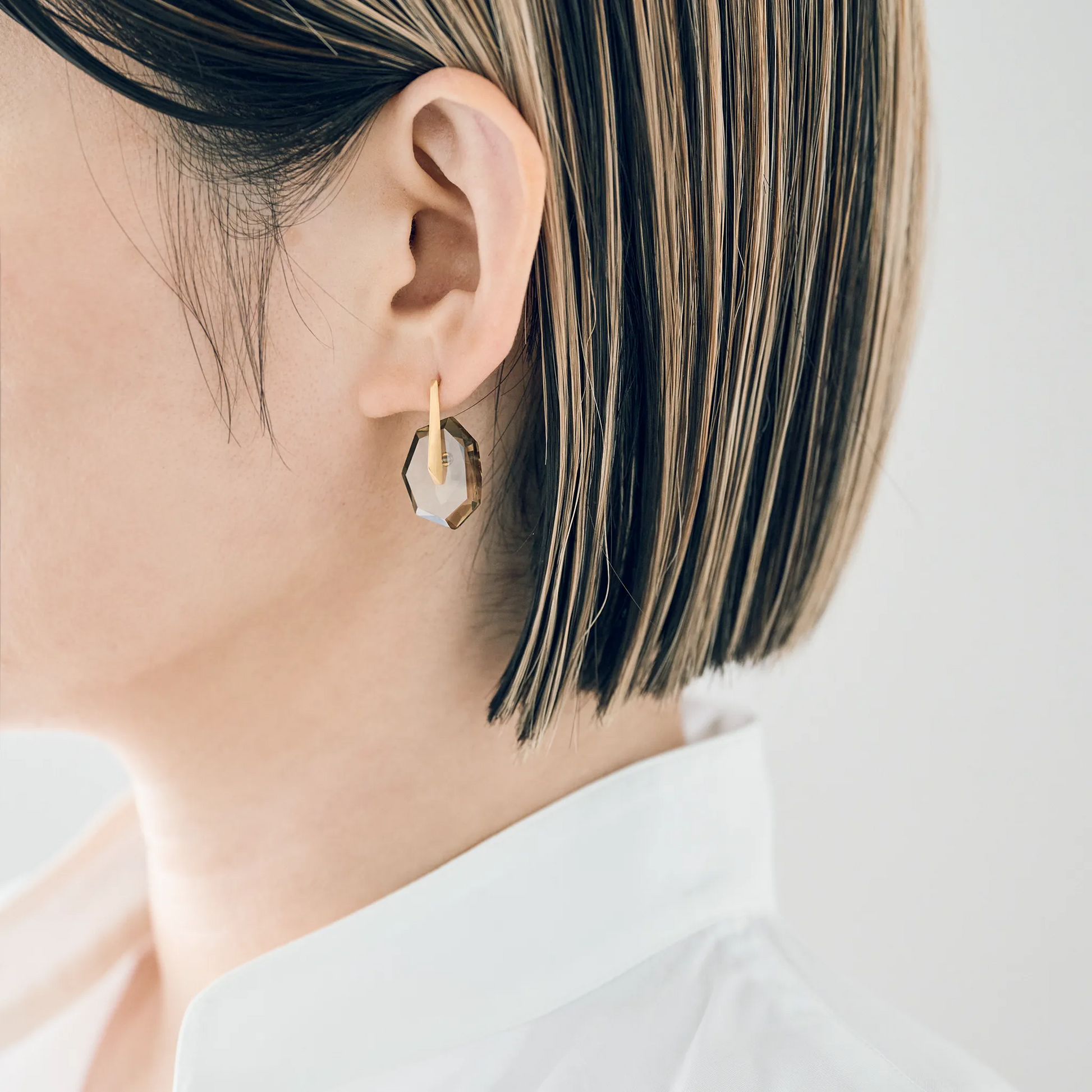 こちらは、バイカラースモーキークオーツをあしらったショートタイプ。構築的なフォルムに、自然が生んだグラデーションの揺らぎが重なります。